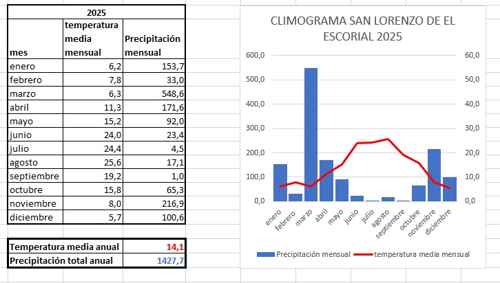 En las imágenes de abajo puedes comparar el climograma histórico con el climograma de 2025 que es desproporcionado y anómalo.